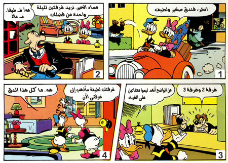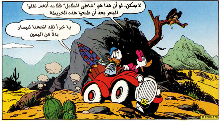Nun mag man sagen, Namen seien bekanntlich Schall und Rauch und Differenzen in der Nomenklatur daher noch lange kein schlagender Beweis für regionale Unterschiede. Es ist also an der Zeit auch einen Blick in die Storys zu werfen, die Disney rund um die Welt erdichten lässt. Zum Beispiel im ägyptischen Studio in Kairo: In der Miikii vom 21. Oktober 2004, noch erhältlich auf den zahlreichen Bücherflohmärkten der Stadt, finden wir die Geschichte „Strand der Sorgen“ (shaaTi’ al-balaabil *). Daisy, die auf arabisch übrigens Ziizii heißt, und Donald, auf arabisch BaTuuT, sind die Helden in diesem Abenteuer, das mit der klassischen Lost-in-the-Desert-Szene beginnt. Daisy/Ziizii hält verzweifelt Ausschau nach dem „Strand der Sorgen“ (nomen est omen!), an dem beide ihre freie Zeit zu verbringen trachten, während Donald das bekannte rote Auto an schroffen Felsen vorbei durch die Wüste steuert. Bei einem Blick auf die Karte ruft er aus: „Oh nein! Wir sind links statt rechts abgebogen!“ Dem anwesenden Geier tropft der Speichel aus dem Mund … Doch Gottseidank finden unsere Helden eine „kleine, nette Stadt“, nebst ebensolchem Hotel. Von dem Ganovenpärchen, welches den Ort in Angst und Schrecken versetzt und ihnen dummerweise zum Verwechseln ähnlich sieht, wissen die beiden Unschuldslämmer zu diesem Zeitpunkt ebenso wenig wie von der nächtlichen Verfolgungsjagd, die ihnen bevorsteht. Auch uns braucht das nicht weiter zu interessieren, es soll nur erklären, wieso dem Portier das Toupet vom Kopf fliegt, als er Donald und Daisy vor dem Tresen erblickt.